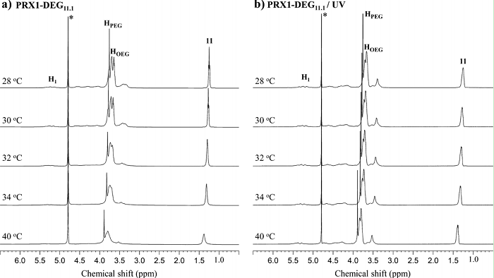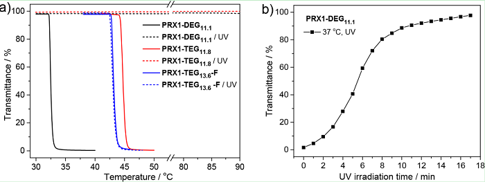 (a)UV照射前后的PRX1-DEG11.1,PRX1-TEG11.8和PRX1-TEG13.6-F的0.25 wt%水溶液的透射率与温度的关系曲线;