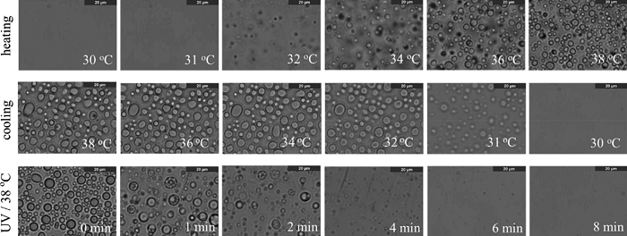 图8 在不同条件下0.25 wt% PRX1-DEG11.1水溶液的光学显微照片