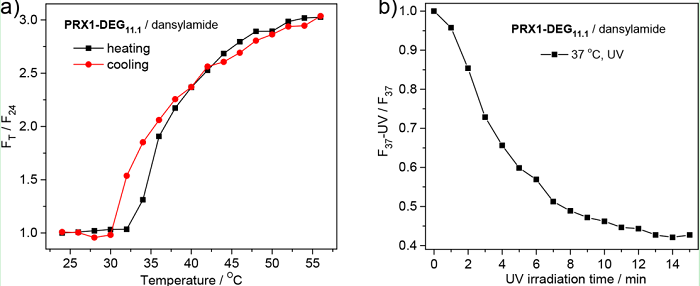 (b)丹磺酰胺在0.25 wt%PRX1-DEG11.1水溶液于37℃下的荧光强度比值F37-UV / F37对紫外照射时间的曲线图。 F37和F37-UV分别表示在37℃下不经过UV照射和经过不同时间UV照射的荧光强度。