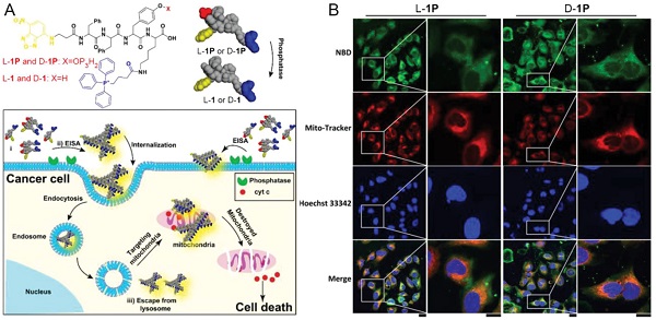 A、前体(L-1P和D-1P)及其相应的成胶分子(L-1和D-1)的化学结构,以及用于靶向线粒体和诱导癌细胞死亡的EISA机理;