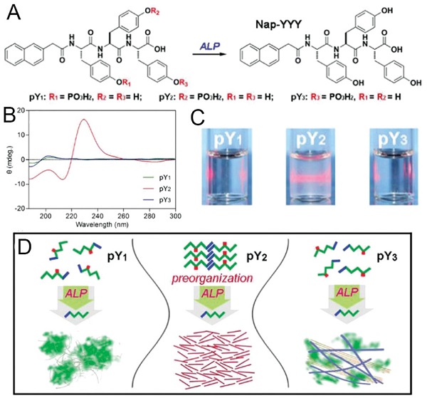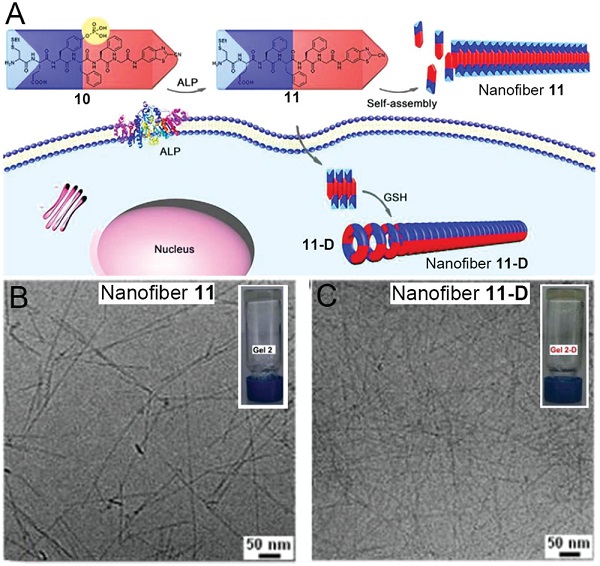 图一、利用肿瘤中过表达的磷酸酶原位形成纳米纤维和水凝胶