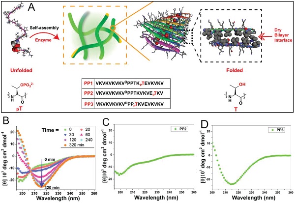 目前已经有许多策略来触发肽的自组装和形成超分子材料,例如温度变化、pH调节、离子强度变化等等,但是大多数策略只能在离体缓冲溶液中使用,与体内环境不同,阻碍了其在生物医学领域的应用。最近,酶促自组装(EISA)策略成为在体内环境中进行原位自组装的有效方法。目前EISA策略已被广泛应用于癌细胞抑制、组织工程以及药物输送等领域。此外,自组装的动力学和热力学途径对于自组装肽的形貌和功能是至关重要的。酶催化在动力学上是可控的,它能够提供更精确且可控的构建多肽类超分子材料的方法。