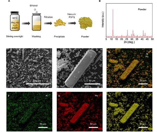 (A)DMAPbI3粉末合成示意图。(B)粉末XRD图谱。(C)和(D)不同放大倍数下的SEM样貌。(E-H)EDX-mapping图像。N、Pb、I元素的分布
