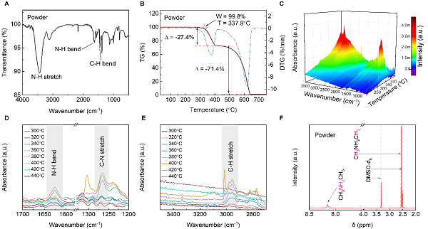 (A)FTIR谱。N-H,C-H振动吸收峰。(B)TG-DTG曲线,(CH3)2NH2I,PbI2两种分解产物的含量分析。(C)三维原位TG-FTIR谱,加热分解过程中的有机分子的红外吸收,温度范围:200-440 oC。(D和E)某一温度截面下的FTIR吸收光谱。(F)1H-NMR谱,C、N键上的H的个数和化学环境