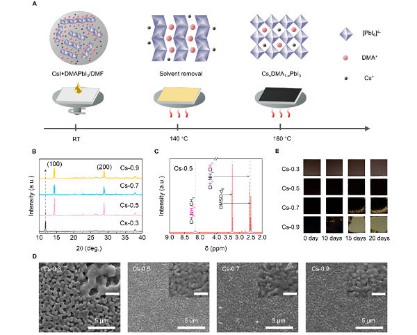 (A)钙钛矿薄膜制备过程示意图。(B)随着Cs含量变化的XRD图谱。(C)Cs-0.5粉末样品溶于DMSO-d6溶液的1H-NMR谱,含有(CH3)2NH2+有机成分。(D)不同Cs含量下的SEM形貌。(E)Cs含量的变化与薄膜稳定性关系测试的光学照片。