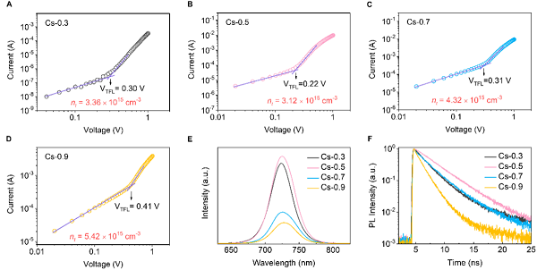 (A-D)空间电荷限制电流法测试不同Cs含量薄膜的缺陷态密度。(E)PL谱。(F)TR-PL谱。随着Cs含量的增加,薄膜中的缺陷态先减少后逐渐增加