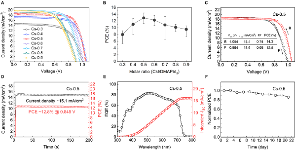 (A)不同Cs含量器件的J-V曲线。(B)Cs含量对效率的影响。(C)最佳器件的J-V曲线;(D)最大功率点输出电流和光电转换效率。(E)外量子效率(EQE)谱。(F)稳定性测试。