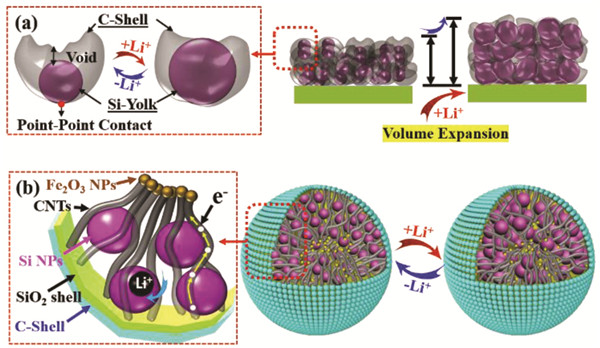 近日,澳大利的格里菲斯大学、中国科学技术大学的赵惠军(通讯)作者等人,首次报道了一种由碳涂层刚性SiO2外壳制成的新型蛋黄壳结构高振实密度复合材料,以限制多个Si NP(蛋黄)和嵌入Fe2O NPs的CNT。获得的高振实密度和优异的导电性可归因于多个Si蛋黄,Fe2O3 NP和CNT Li+储存材料有效利用的内部空隙,以及内部Si蛋黄和外壳之间通过导电CNT“高速公路”的桥接空间。可在450个循环后,半电池实现3.6 mAh cm-2的高面积容量和95%的可逆容量保持率。在300次循环后,富含Li的Li2V2O5正极的全电池实现260 mAh g-1的高可逆容量。相关成果以“A unique yolk-shell structured silicon anode with superior conductivity and high tap density for full Li-ion batteries”为题发表在Angewandte Chemie-International Edition上。