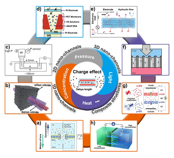(g) 基于带相反电荷的层状氧化石墨烯复合膜的渗透能转换系统的示意图;