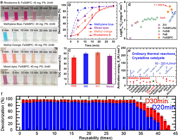 a)不同有机污染物褪色的视觉效果;b) 不同有机污染物褪色效率;c) 不同有机污染物总有机碳去除率;d)与其他铁基催化剂降解效率的对比; e)反应驱动能的对比;f) Fe83Si2B11P3C1 金属玻璃条带催化稳定性