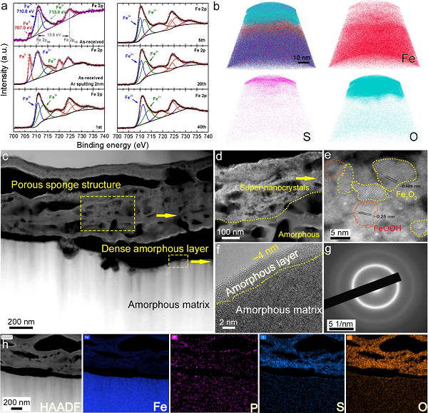 a)原始非晶条带与催化使用后的非晶条带的XPS结果;b) 使用后非晶条带的三维原子探针技术分析;c) 使用后非晶条带的截面高分辨球差透射电镜分析;d,e,f) 图c中放大高分辨球差透射电镜分析;g)非晶基体的选区电子衍射分析;h) Fe, P, S, O的电子能量损失分析