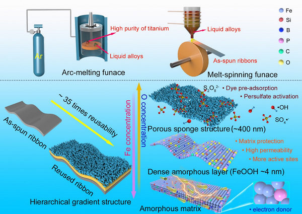近日,香港城市大学吕坚教授(通讯作者)课题组通过微合金化调节铁基金属玻璃条带 (原子比为Fe83Si2B11P3C1)的原子排位情况,从而有效的调控电子结构,使其表面电子发生离域促使在催化过程中得到更有效的电子转移,废水处理效率得到极大的提升。更重要的是,在催化过程中,铁基金属玻璃条带会发生原位自重构,自发的生成多层梯度结构,极大的提高了废水处理中的稳定性。这种新型铁基金属玻璃催化剂很好地满足了上述催化效率和稳定性不能同时兼顾的需求。研究发现,微量添加的P原子只与Fe原子发生配位形成Fe-P键,其适中的电负性和键长(2.25 Å)能够稳定Fe原子的非晶态并且拥有更高的活性位点及导电性。此外由于P元素的添加,金属玻璃条带表面电子态密度在费米能级处更为平缓,意味着表面电子发生离域从而使得电子转移效率极大的提升。由于这种独特的电子结构设计,该铁基金属玻璃条带具有极高的工业废水处理能力,在不加入任何外界条件刺激下(热,光,电等),对常用的工业染料(罗丹明,甲基蓝,甲基橙及混合液)在30分钟内可实现全部褪色。并且,与传统的芬顿反应环境(pH 3-5)相比,微量添加过氧硫酸盐(2mM)可不必调控苛刻的酸性反应条件,废水可直接被快速降解。同时,在循环使用过程中,金属玻璃条带会自发形成多层梯度结构,对活性位点的保护,过氧硫酸盐的吸附与激发,及良好的离子渗透性提供了有利保障。研究表明,此金属玻璃条带的循环次数高达35次且保持同样的催化效率,为工业化污水处理提供了广阔的应用前景。相关研究结果被选为back cover发表在Advanced Functional Materials上,文章的第一作者为贾喆(香港城市大学高级副研究员)和王庆(上海大学材料研究所/香港城市大学)研究员。