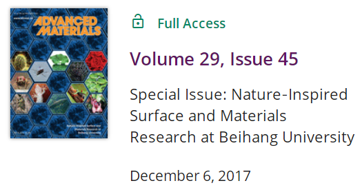 除了海外高校,国内也有不少高校做过这样的special issue。比如北京航空航天大学在Adv. Mater.的volume 29,issue 45中,以“Nature‐Inspired Surface and Materials Research at Beihang University”为主题,介绍了北京航空航天大学在受天然生物表面启发的超润湿系统方面的研究进展。