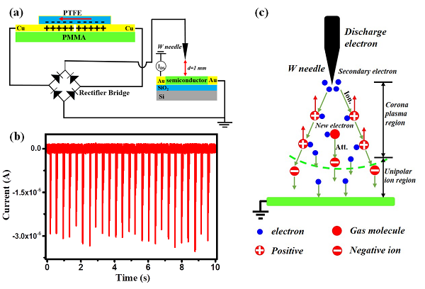 (a)基于摩擦纳米发电机诱导的气体放电的表面离子栅调控技术示意图。(b)摩擦纳米发电机诱导的气体放电的电流时间曲线。(c)负电晕放电离子运动示意图。