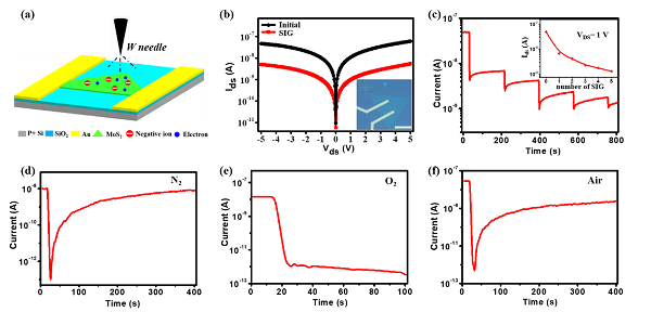 图2 (a)表面离子栅调控MoS2器件的示意图。(b)表面离子栅调控MoS2器件的I-V特性曲线,插图是被调控器件的光学图像,比例尺为20 μm。(c)利用表面离子栅技术多次调控MoS2器件的I-V特性曲线,插图是器件电流与表面离子栅调控器件次数对应曲线,Vds为1V。(d)-(f)是在N2,O2和空气条件下,表面离子栅调控MoS2器件的电流-时间特性曲线。