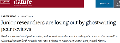 1、Junior researchers are losing out by ghostwriting peer reviews. Nature Careers News, May. 13, 2019.