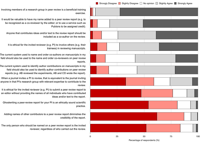 这项研究发现很大比例的研究生和博士后为研究员、学术领头人(principal investigators–PIs)代写同行评议。参与调查的79%的博士后和57%的研究生表示:他们为同行评议提供过想法或文本,以及他们对这些评议的看法。大多数学员这样做了不下5次,但少数人报告说有21次或更多这样的经历。文章称,一半的受访者表示,他们都曾代写过一篇同行评议,但80%的受访者表示,他们觉得这种做法不道德。