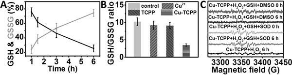 (A) 在不同时间点上,Cu-TCPP和GSH混合溶液的上清液中GSH和GSSG的含量;
