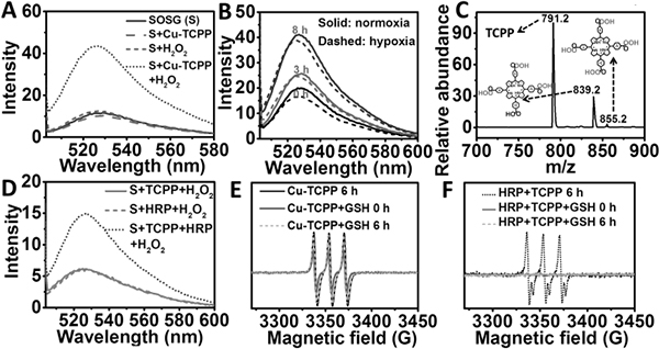 (B) SOSG检测到常氧和缺氧条件下Cu-TCPP纳米片与H2O2产生的1O2;