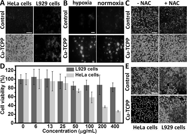 (B) Cu-TCPP纳米片处理前后,在常氧和缺氧条件下染色的HeLa细胞的CLSM图像;