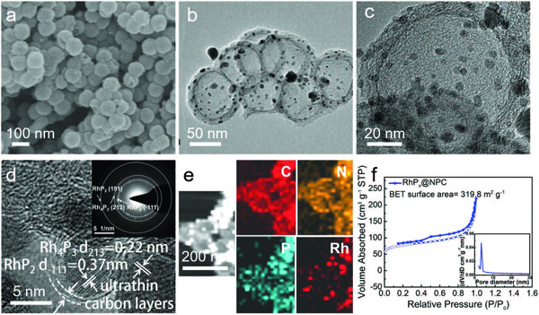 a-f)RhPx@NPC纳米壳的a)SEM,b,c)TEM,d)HRTEM,e)元素分布图像,f)N2吸附-解吸等温线和孔径分布图。