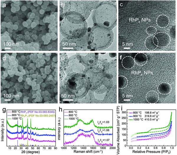 g-i)分别在800、900 和1000℃下煅烧的RhPx@NPC的g)XRD图,h)拉曼光谱,i)N2吸附-解吸等温线。