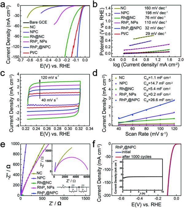 a,d)裸GCE、NC、NPC、Rh@NC、RhPx NPs、RhPx@NPC和Pt/C电极在1.0 M KOH和1.0 M PBS中扫描速率为5 mV s−1时的极化曲线。
