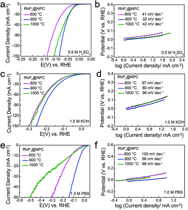 a-f)分别在不同电解质中在800、900和1000℃下煅烧的RhPx@NPC的a,c,e)极化曲线和b,d,f)的塔菲尔图。