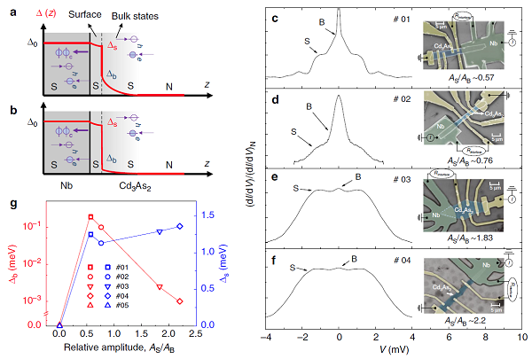 (a.b) 两个体系由顶部至底部的异质结示意图:由于邻近诱导超导性块体和表面通道共存,超导序参量在Cd3As2离界面不同距离的区域有不同幅度的衰减;