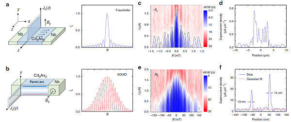 (a)左图为磁场沿平面外方向的Josephson结示意图,沿着x方向Cd3As2中充满了超导电流,并且沿z轴方向电流密度均匀分布;右图为对应的临界电流随着磁场的关系分布,符合Fraunhofer模式;