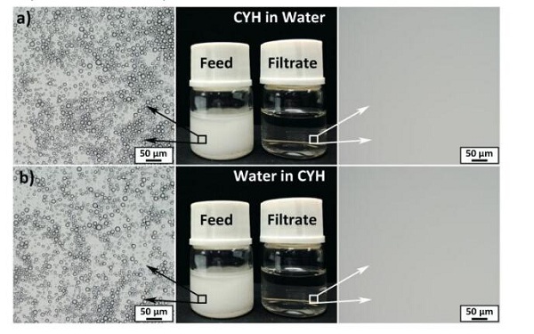 (a) 水浸润的CTFPNM对水包油型(环己烷/水)乳状液中的分离