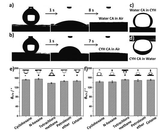 (c,d) CTFPNM的在环己烷中水接触角(θw/o)和在水中环己烷接触角(θo/w)