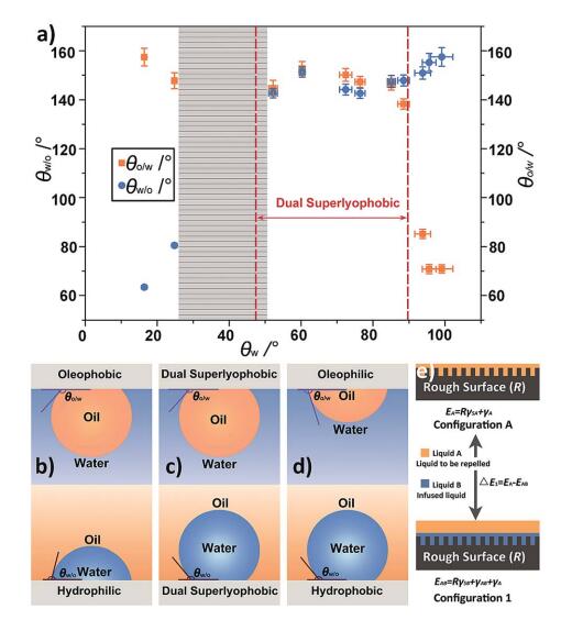 相比于润湿行为不可逆的材料,具有可调控浸润性的表面在液体输送、微滴反应器以及选择性油水分离等领域中有着更为广泛的应用,因此获得了人们的极大关注。其中,液下双疏的表面材料的浸润性可随预浸润液体的不同而改变,即当水浸润时显示疏油性,当油浸润时显示疏水性。目前关于该类表面材料的报道较少,并且没有对这种特殊浸润性的机理加以研究,因此这类材料的定向制备仍具挑战性。