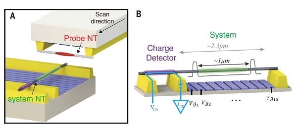 魏茨曼科学研究院的S. Ilani(通讯作者)等人利用以碳纳米管作为探针的扫描探测平台来对强相互作用电子的多体密度进行成像分析。通过在真实空间中对电荷密度进行成像,研究人员成功地直接观测到了一维维格纳晶体。在这一平台中,研究人员利用纳米组装技术制备了相互垂直的碳纳米管器件。通过这一方法,可引入另一碳纳米管作为扫描-电荷扰动,最终才能实现对碳纳米管的多体电子密度的微创性成像。最终的实验结果发现,被约束在一维的少数电子与理论预言的强相互作用晶体匹配,表明维格纳晶体在一维中是可以被直接观测到的。这些实验说明,通过在真实空间中对多体密度的成像,有可能为研究相互作用态提供新型的策略。2019年05月31日,相关成果以题为“Imaging the electronic Wigner crystal in one dimension”的文章在线发表在Science上。