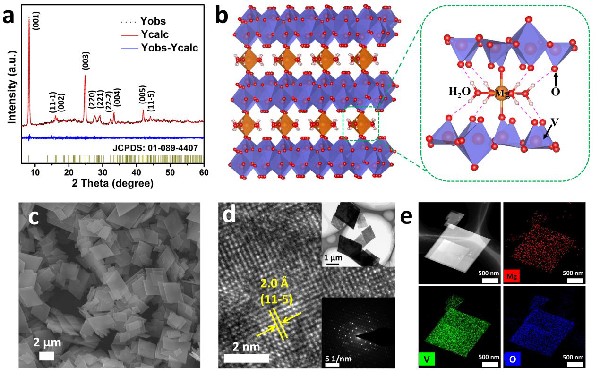 a) Mg0.25V2O5·H2O的XRD图谱和Rietveld精修;
