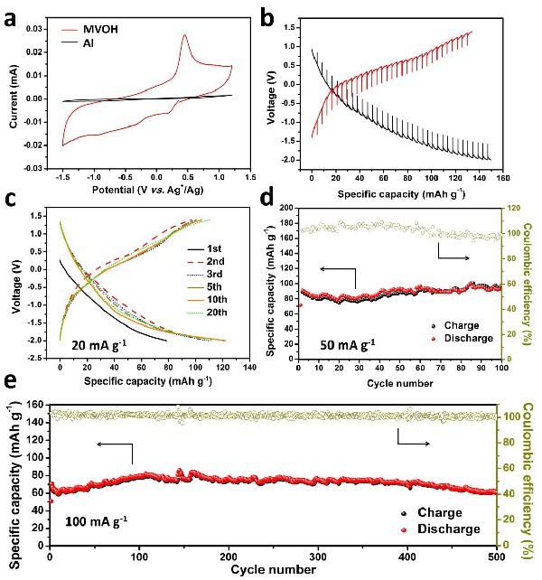 d,e) 在50 mA·g-1和100 mA·g-1的电流密度下,Mg0.25V2O5·H2O基于两电极系统的储Ca2+循环性能。