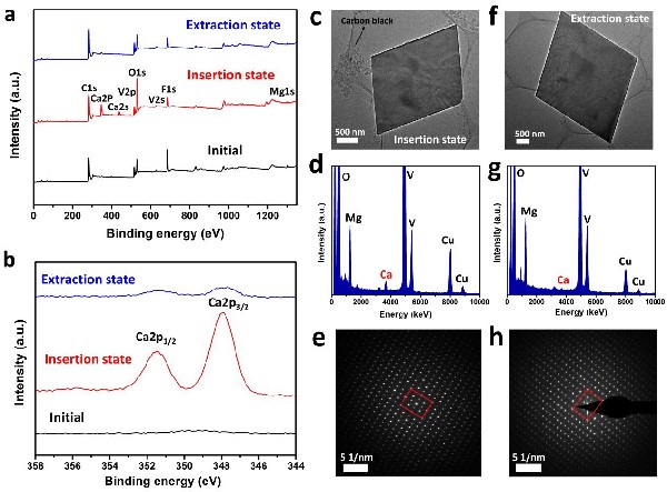 非原位XPS和EDX结果表明Ca2+在Mg0.25V2O5·H2O中发生了可逆的嵌入脱出,而TEM和SAED结果表明Mg0.25V2O5·H2O在Ca2+的嵌入和脱出状态下结构未发生明显改变。