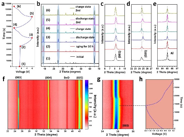 非原位XRD结果表明在6个不同状态下XRD图谱显示(001)峰和(003)峰只发生十分微小的偏移,根据峰的偏移可计算出充放电过程中层间距的变化仅为~0.09 Å。原位XRD进一步证明了Ca2+在嵌入脱出过程中(003)峰的微弱变化,并证明Ca2+嵌入过程为单相固溶反应过程。