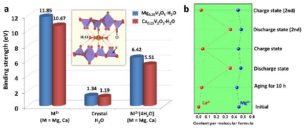 a) M0.25V2O5·H2O晶体结构中M2+(M = Mg,Ca)、结晶H2O和M2+[4H2O]的结合强度对比,插图为相应晶体结构;