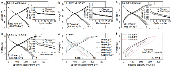 亮点:实现了Mn2+/Mn4+的双氧化还原电对反应,从而使得富锂正极材料具有高的比容量和能量密度