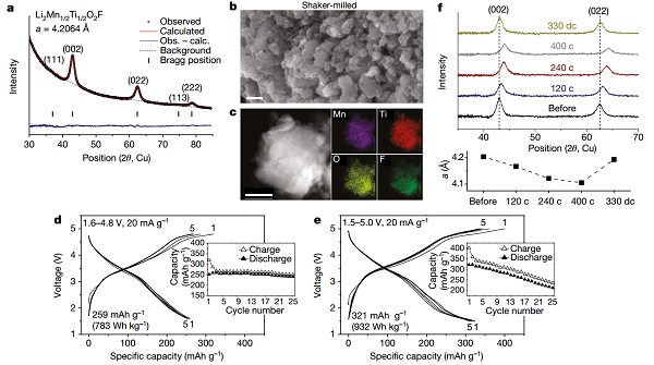 图13 Li2Mn1/2Ti1/2O2F的结构表征和电化学性能