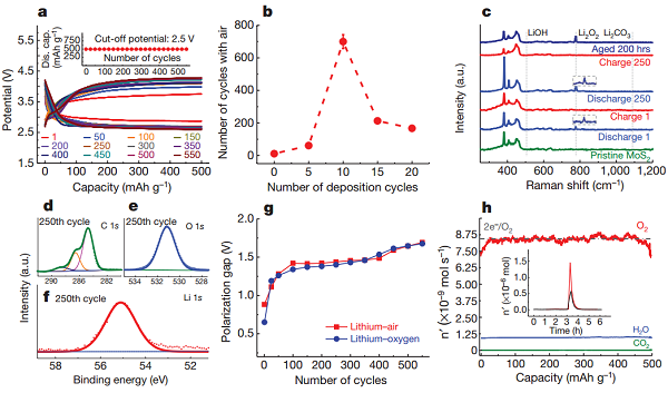 由于锂空气电池具有与汽油相比拟的能量密度,它一经提出就受到了巨大的关注,未来也有可能在电动汽车领域取代传统的锂离子电池。然而,尽管它被称为锂空气电池,但是其主要还是在纯氧气环境下运行。准确的说,大部分锂空气电池其实是锂氧气电池。而且,由于在正极,负极和电解液中广泛存在着副反应,锂空气电池的寿命通常都比较短。如果在有其他气体存在的情况下,比如N2,CO2和H2O,副反应将会变得更加复杂和严重。不过,如果锂空气电池仅限在纯氧气环境下使用,那就还要附加储存氧气的设备,这将极大地降低锂空气电池的能量密度。因此,开发出能够在空气或者类似空气气氛下使用的锂空气电池就显得极为重要。本文的作者就设计了一种新型的锂空气电池体系,它由Li2CO3/C保护的锂负极,二硫化钼正极和离子液体/DMSO电解液组成。该体系可以在类似空气的气氛下(O2,N2,CO2和H2O)稳定运行700次。此外,作者也采用了理论计算对该体系进行了深入探究。这种可以在近似空气气氛下运行,具有长循环寿命的锂空气电池是后锂离子电池技术的一大进步。