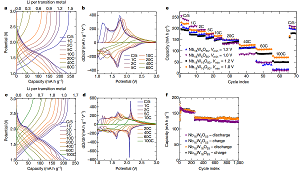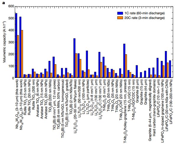 亮点:开发了两种新型的铌钨氧化物材料,其独特的结构使得材料即使在微米级别也具有极高的倍率性能,因而也具有高的体积比容量。