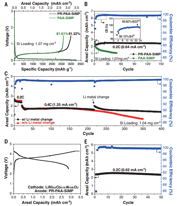 亮点:本文提出一种可有效改善传统粘接剂的方法,只需要在聚丙烯酸粘接剂中加入少量的聚轮烷,就可以使其具有高弹性的特点,从而显著改善硅负极材料的性能。