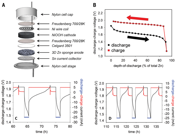 亮点:把传统的锌粉替换为三维的锌海绵,不仅可以构建具有深度放电特性的一次镍锌电池还可以用来制备可以循环几万次的二次镍锌电池。