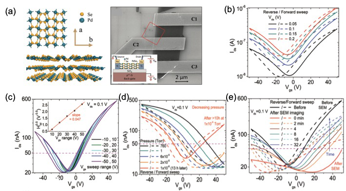 图(a)PdSe2晶格结构及场效应晶体管SEM图;(b)不同偏压下转移特性曲线图;(c)不同扫描栅压范围下的转移特性曲线;(d)电子束辐照对于器件性能的影响及随时间的恢复过程;(e)压强可调的回滞窗口及不同掺杂类型之间的转换。