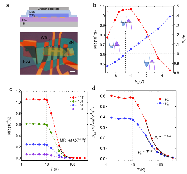 a. h-BN保护的WTe2薄膜器件图(下)及器件侧视示意图(上)。 磁电阻以及电子空穴浓度比随栅压的变化。c.磁电阻随温度变化曲线。d. 迁移率随随温度变化曲线,插图:电子空穴浓度比随温度变化曲线。