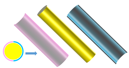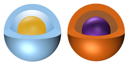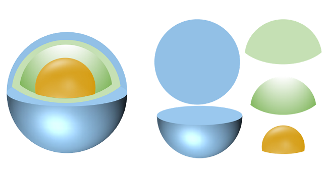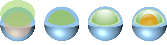 将切面组合好放到球体上层,然后将切面复制等比例缩小后,填充其他颜色再放置于最上层,依次类推。用一个球体的图片与椭圆取交集,可以得到一个球体核心,放置于最顶层。这样可以制作任意层数的核壳结构。