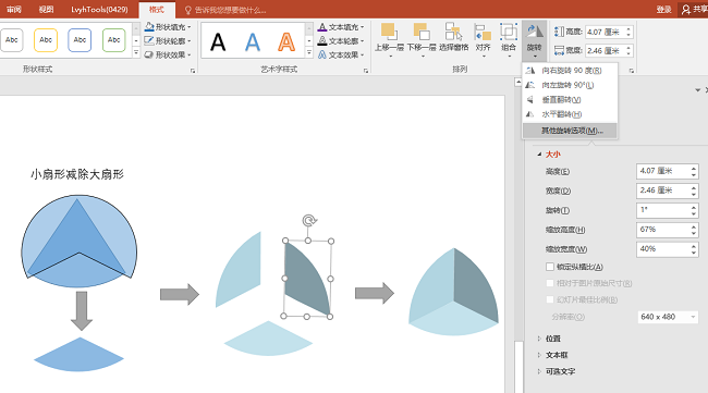 复制成三份,调整好角度,在格式-旋转-其他旋转选项里可以精确调整旋转角度。对齐到一起,填充上三种深度不同的颜色,即可得到切面。