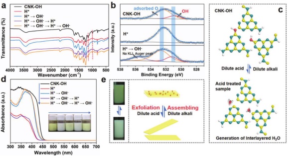 - e) 可逆剥离-再组装过程图,包括OH基团和偏厚度可逆性。